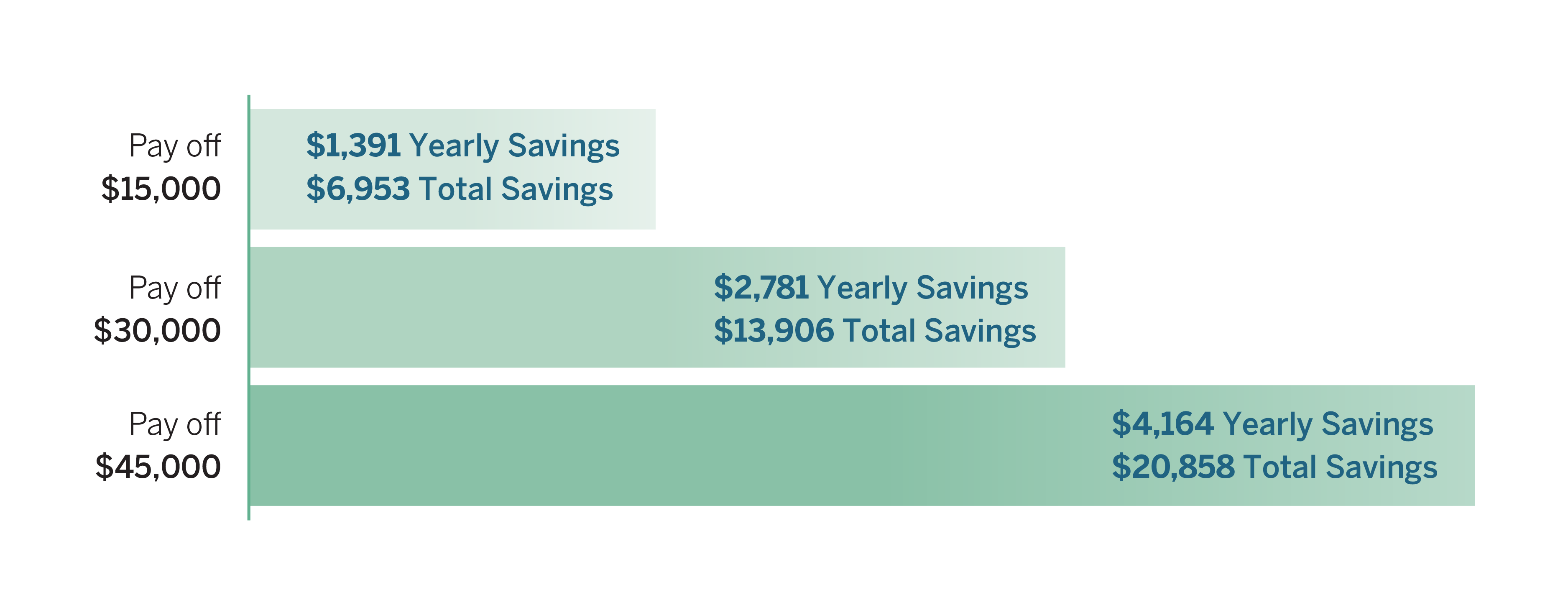 †Illustrative examples determined through Bankrate.com's Debt Consolidation Calculator at www.bankrate.com/loans/personal-loans/debt-consolidation-calculator/ and assume current credit card debt amounts at 21% are replaced with a new loan at 5.99% APR with a 60 month term. $15,000 example based on existing monthly payment of $406 and new monthly payment of $290. $30,000 example based on existing monthly payment of $812 and new monthly payment of $580. $45,000 example based on existing monthly payment of $1,217 and new monthly payment of $870. Actual savings will depend on the specific terms of your current debt and the terms of any new loan for which you are approved.